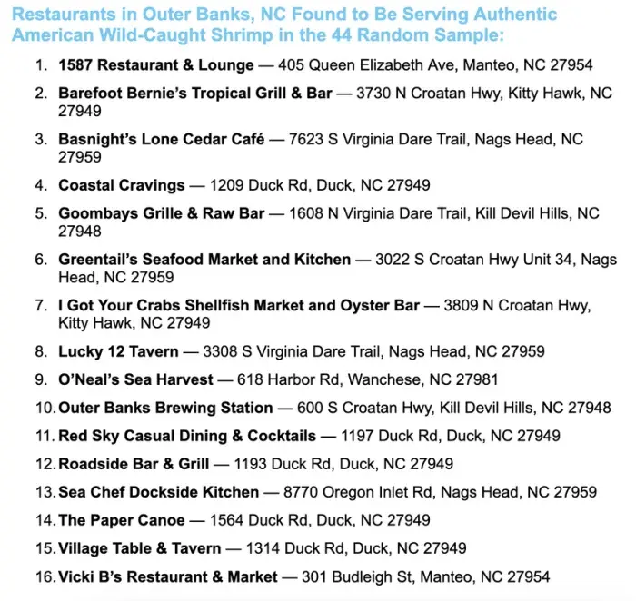 بر اساس گزارش، از ۴۴ رستوران، ۴۳ رستوران بهصورت شفاهی اعلام کردند که میگوهای بومی و صید شده در آبهای آمریکایی را سرو میکردند.