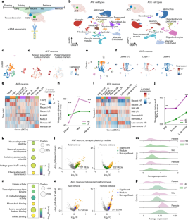 a, b, تخمین چگالی هسته‌ای (Kernel density estimate) نمودارهای tSNE از نورون‌های ANT (a) یا ACC (b) برای هر تکرار زیستی (n = 2‑3 موش در هر نقطهٔ زمانی) در تمام زمان‌های بازیابی. c, d, تجسم tSNE از مسیر زمان‌سنجی ANT (c) یا ACC (d) که به کلاس نورونی در ANT و لایهٔ آناتومیک در ACC رنگ‌آمیزی شده‌اند. e, نمودار میله‌ای درصد نورون‌های Fos+ در طول نقاط زمانی در نورون‌های ANT (چپ) یا ACC (راست) که برای ساخت مسیر زمان‌سنجی استفاده شده‌اند. f, g, تجسم tSNE از مسیرهای ANT (f) یا ACC (g) که با نورون‌های Fos+ که چگالی نمره‌شده ≥ 0.6 هستند، رنگ‌آمیزی شده‌اند. h, همپوشانی DEGs به‌دست آمده از همه نورون‌ها یا فقط Fos + سلول‌ها. برای بازیابی میانی در ANT (چپ) و برای بازیابی میانی و دور در ACC (راست) نشان داده شده است. i, نمودارهای چگالی برای نورون‌های HR و LR در ACC بر روی فضای زمان‌سنجی tSNE در طول روزهای بازیابی. ACC، قشر پیشانی پیش‌پیش؛ ANT، تالاموس آنترومیدال؛ DEGs، ژن‌های متفاوت بیان‌شده؛ HR، تکرار‑بالا؛ LR، تکرار‑پایین.