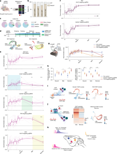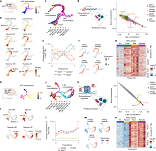 a, تجسمات tSNE از مسیرهای زمان‌سنجی ANT (چپ) و ACC (راست) که با فراوانی همسایگی سلول‌های شرایط HR یا LR رنگ‌آمیزی شده‌اند. b, مسیرهای زمان‌سنجی رنگ‌آمیزی شده بر حسب متوسط بیان DEGs از آموزش اولیه و بازیابی دور در ANT (چپ)؛ بازیابی اخیر و بازیابی دیر‑دور در ACC (راست)، واحدها log2CPM + 1 هستند. c, مسیر زمان‌سنجی ANT رنگ‌آمیزی شده بر حسب متوسط بیان ژن‌های IEGs (Immediate Early Genes) مرتبط با یادگیری، واحدها log2CPM + 1. d, مسیرهای زمان‌سنجی ANT (چپ) یا ACC (راست) به دست آمده با الگوریتم CellRank. ستاره‌ها نقاط اوج را نشان می‌دهند. e, بیان ژن‌های مرتبط با ماژول پلاستیسیتهٔ سیناپسی در ANT (چپ) در میانی‑بازیابی و ماژول متیلاسیون هستونی در ACC (راست) در دیر‑دور، هر نقطه داده نمایانگر یک موش منفرد است، میانگین بیان به‌صورت واحدهای log2CPM + 1 نمایش داده شده، داده‌ها میانگین ± SEM (نوار خطا) هستند. f, بیان ژن‌های همبسته با ماکروستیت دیر در ANT (چپ) یا ماکروستیت دیر‑دور در ACC (راست) در شرایط HR و LR