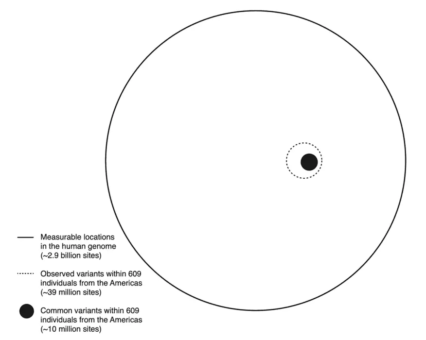 پژوهشگران این روش را در جمعیتهای مختلف تکرار کردند و بهطور مستمر تعداد مکانهای متغیر نسبت به کل طول ژنوم بهطرزی شگفتانگیز کم یافتند. بهعنوان مثال، ۹۹ ساکن یوتا با ریشهٔ شمالی‑غربی اروپا ۵,۷۲۶,۳۷۷ واریانت نشان دادند، در حالی که ۹۶ کارائیبئِی آفریقایی از باربادوس ۸,۰۱۸,۶۴۹ واریانت داشتند (دومین عدد احتمالاً نشانگر تنوع ژنتیکی بالاتر در آفریقا است). مهمتر از همه، در میان جمعیتها، میزان همپوشانی در واریانتهای متداول بسیار زیاد است، به این معنی که گروههای انسانی واریانتهای اختصاصی کمی دارند. در واقع، واریانتهایی که در یک منطقه جغرافیایی خاص متداول هستند، معمولاً بهصورت انحصاری به آن منطقه محدود نیستند؛ آنها با فراوانیهای مشابه در جمعیتهای دیگر در سراسر جهان حضور دارند.